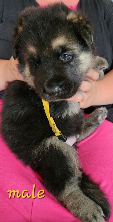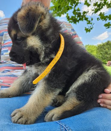 Duke was born in June 2023. He is a Schutzhaus/Sackett puppy. His mother is our Greta, and his father is Sackett Shepherd's male, Bear. Duke is a very large, but lean, black and tan saddle-back. Duke currently weighs 117 pounds and is very tall. We predict that Duke will mature to approximately 130+ pounds. Duke is very gentle and loving, just like his parents. They do not get any sweeter than this big boy! Look at his soft eyes. Duke has passed his CGC test!
