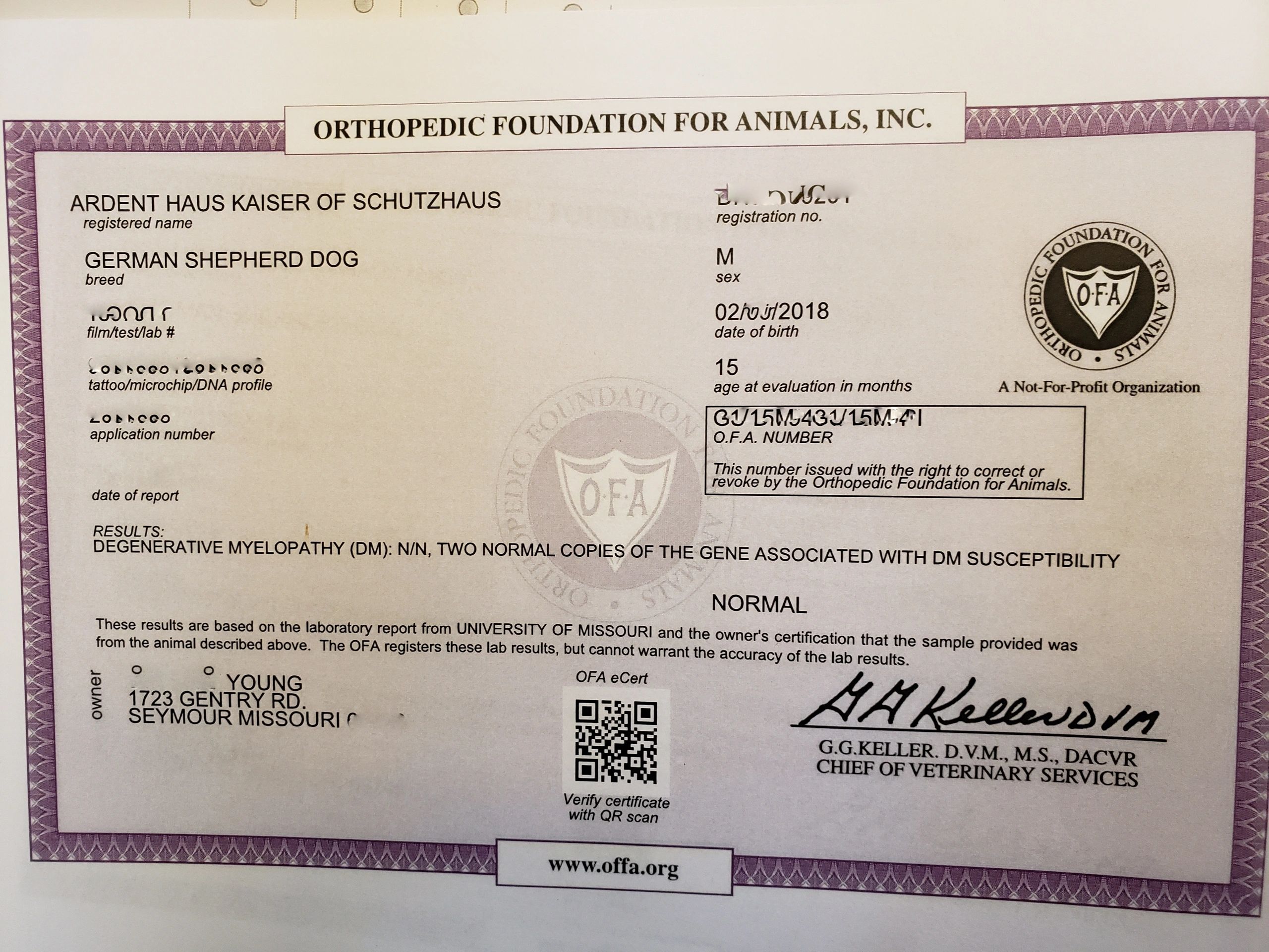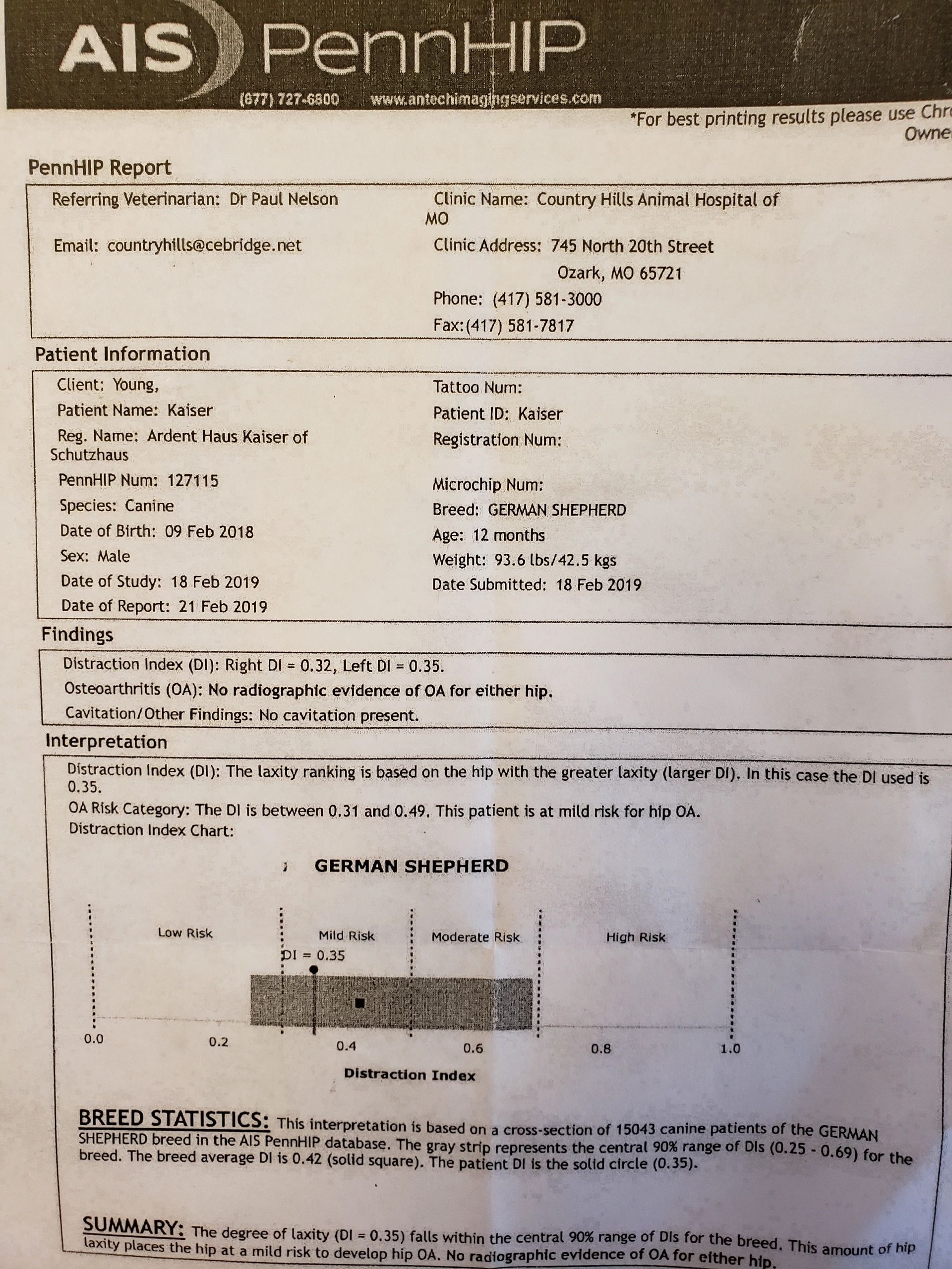 Testing: Kaiser has had his Embark testing completed and he is completely clear of over 200 genetic health conditions that Embark tests for. Kaiser's DM test was normal and he is a non-carrier. That means he can only transmit the normal gene to his offspring, and is unlikely that he or his offspring will ever develop DM. His DM test results from OFA is posted below. Kaiser's PennHIP distraction index was 0.35. His PennHIP test is shown below.